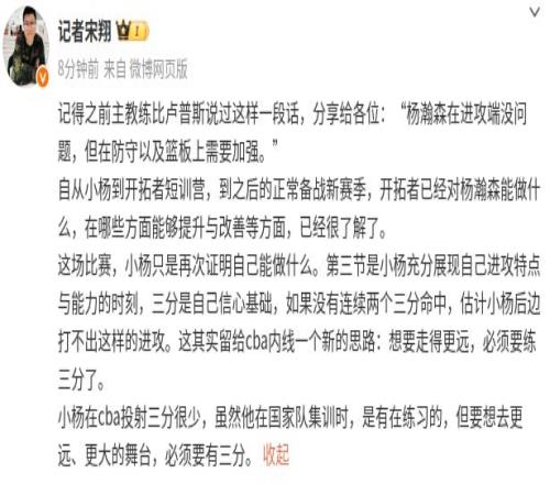 “这场比赛,小杨只是再次证明自己能做什么。第三节是小杨充分展现自己进攻特点与能力的时刻,三分是自己信心基础,如果没有连续两个三分命中,估计小杨后边打不出这样的进攻。这其实留给cba内线一个新的思路:想要走得更远,必须要练三分了。小杨在cba投射三分很少,虽然他在国家队集训时,是有在练习的,但要想去更远、更大的舞台,必须要有三分。”